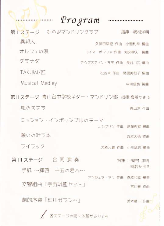 曲名 作曲者 編曲者 第Ⅰ部 メヌエット G.ボルツォーニ A.アマディ イタリアーナ 不詳 日比野俊道 ひき潮 R.マックスウエル 武藤理恵 哀愁のアダージョ M.ヴァケス 宮田俊一郎 愛器を奏でて A.アルトマン 中川信良 星に願いを L.ハーライン 肝付兼美 カッチーニのアヴェ・マリア G.カッチーニ(V.ヴァヴィロフ 森本和幸 第Ⅱ部 テレサ・テンヒットメドレー 三木たかし yutaka‐s ネコふんじゃった変奏曲 藤掛廣幸